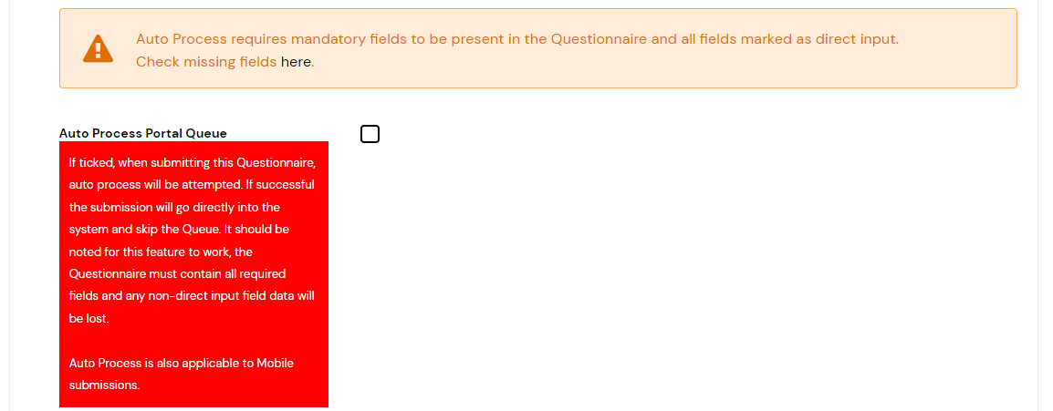 2. The Second Reason a Record may not be auto-processing is due to missing mandatory fields, this is when a field is mandatory in the Assure Form but has not been placed on the Questionnaire.