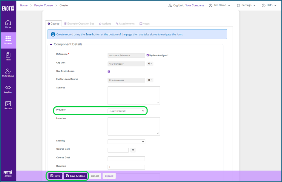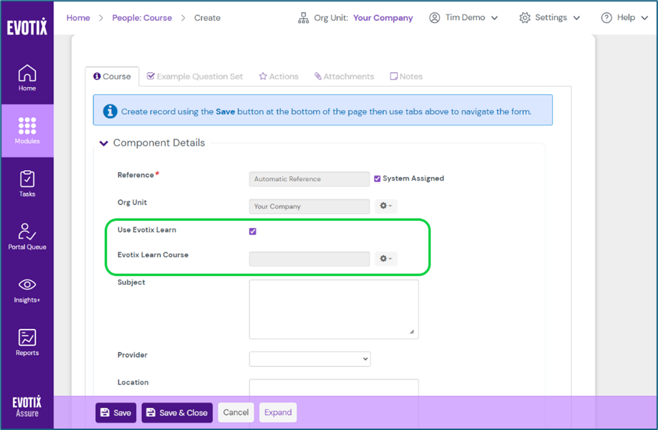 - The "Use Evotix Learn" option must be enabled in Assure (contact your System Administrator if not visible).