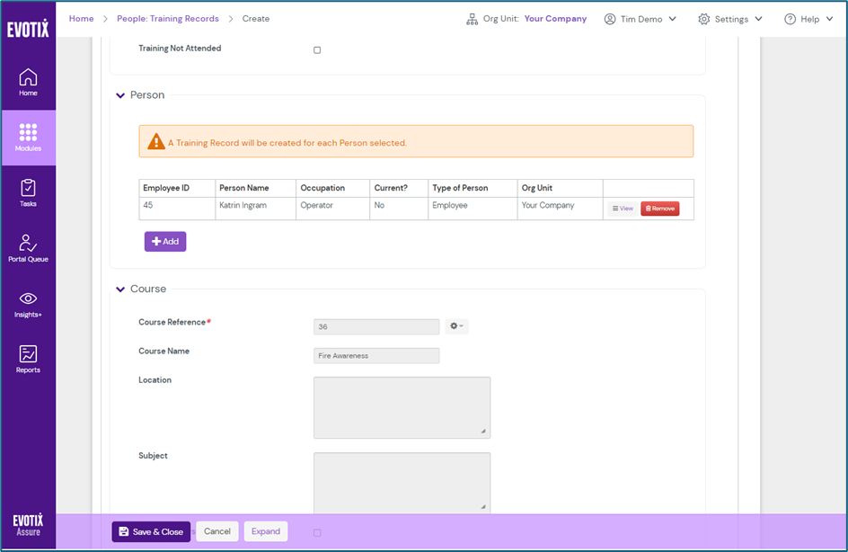 - Navigate to People Module > Training Record in Assure.