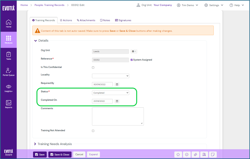 - Product Area: Assure (People & Training Module), Evotix Learn