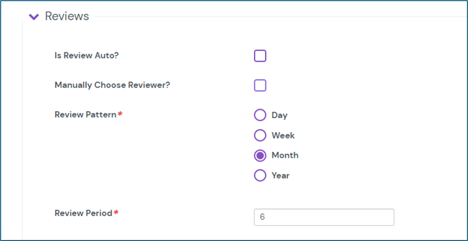 - Define the Review Pattern by specifying the frequency and timing for automatic reviews.