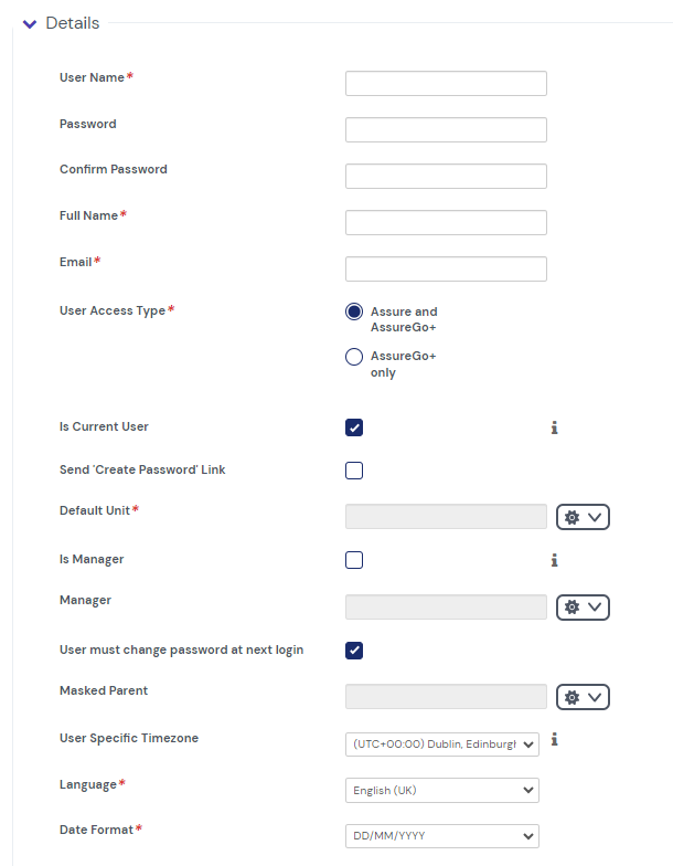- Password - This is not a mandatory requirement to set up a user and can be set at anytime by an administrator manually, however we recommend using the Send “Create Password” Link which will send the user an email with a link to set their password themselves. The link is valid for 48 hours or until they set their password. You can reissue the email if required.