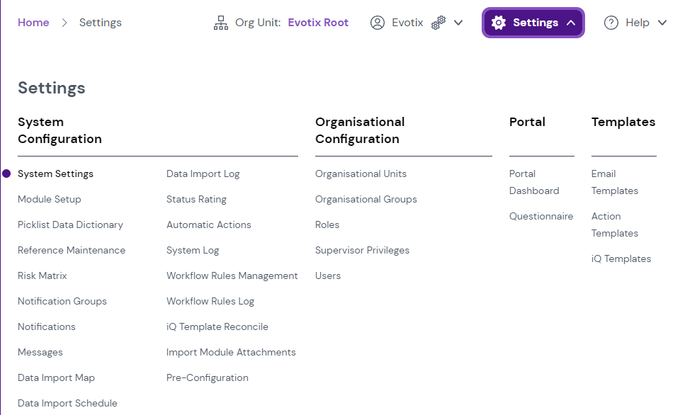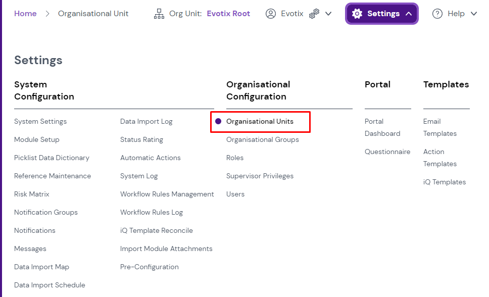You will then be required to navigate to the list of Organisational Units, via settings