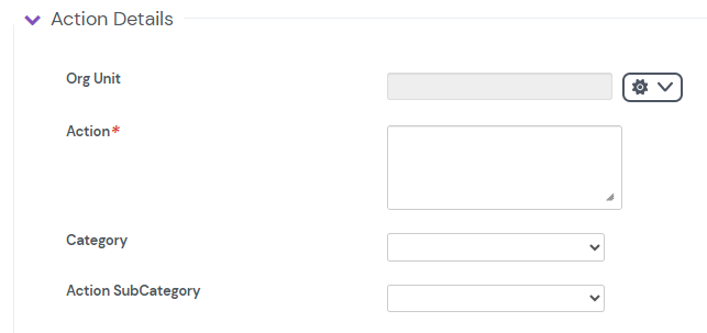 The category and subcategory can be chosen from values in a drop-down list within the Action page.