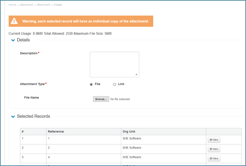 Multi Mode allows you to select records across Organisational Units if your permissions allow. The attachment will be added to all selected records regardless of their Org Unit. Ensure you have Write permission to all Org Units represented in your selection.