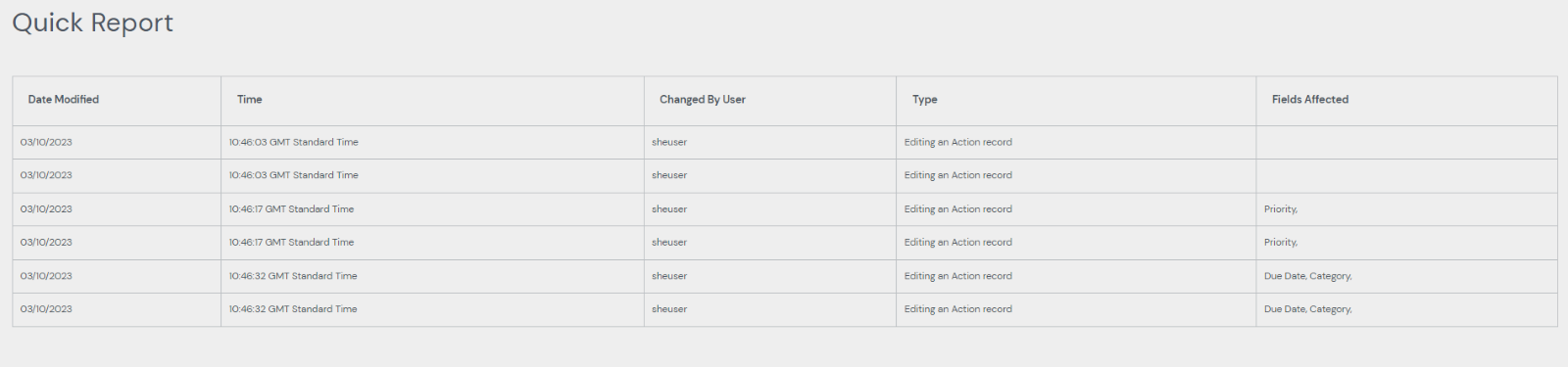 The quick report option will display an action’s log within the webpage for you to export as you prefer.