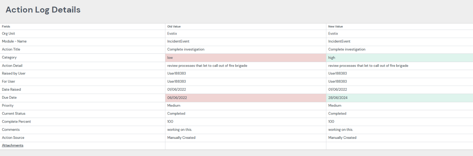 If you select the ‘View Details’ icon against a user's amendment, it will open the Action Log Details that will highlight the old to new value where the user has made an edit.