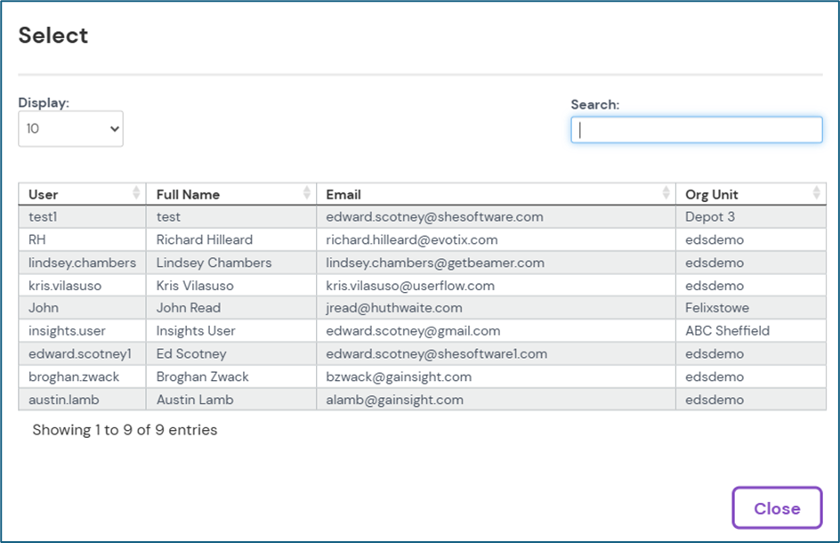 6. From the selector that appears, choose the user who will act as the 7 Day Incident Notification Recipient.