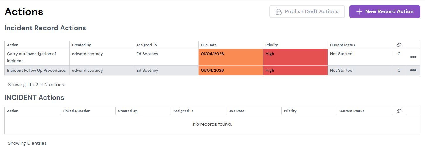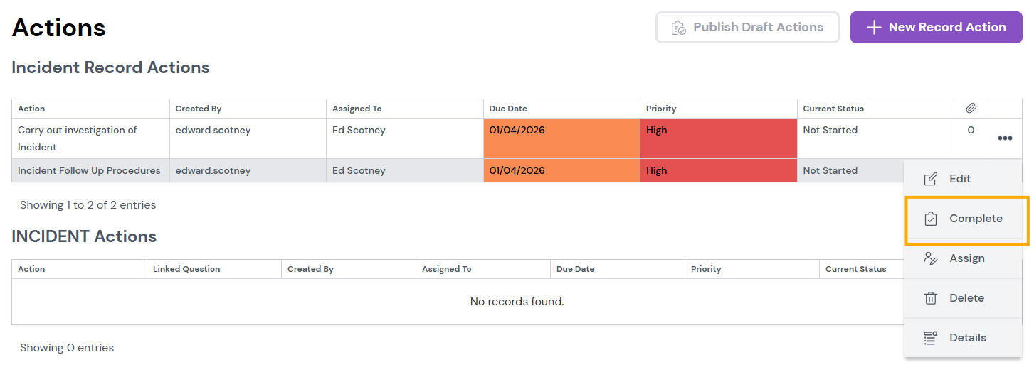 Note: Only the user assigned to the Action, or a user with appropriate Override Actions permissions, can complete an Action on behalf of another user.