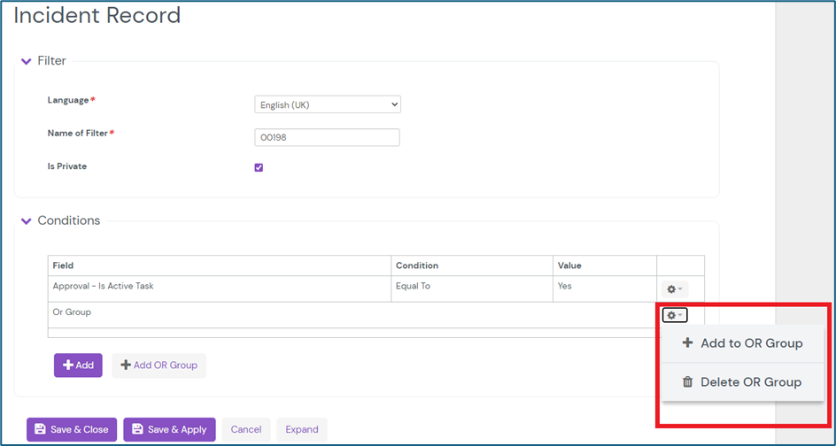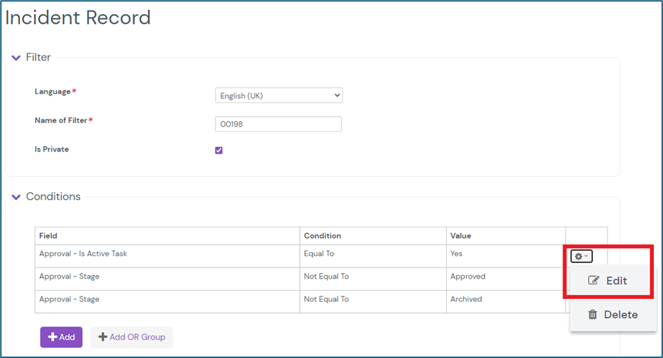 6.2 To delete an OR Group, click the Cog Menu and select Delete OR Group.