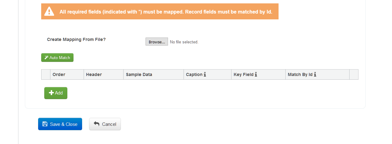 The Caption – This drop down allows you to select the field you wish the current column to be mapped to.