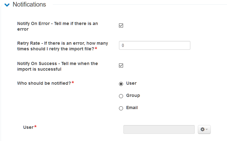 Notifications: This is for who should be notified about the results of the data import, it will send an email summary of the data-import results to the specified user.