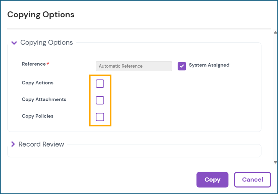 - Suggested embedding keywords: copy Assure record, duplicate module record, copy actions attachments policies, set record review on copy, edit copied record, module record duplication, Assure cog menu copy