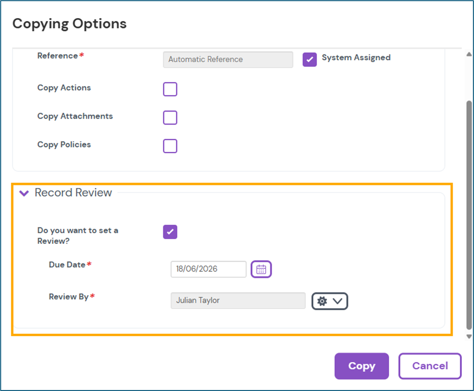 Note: Setting a Record Review schedules the copied record for periodic validation to ensure its information remains current and accurate.