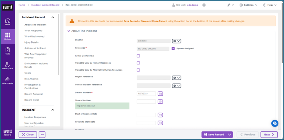 1.1. Navigate to the relevant Module in Assure (for example, Incident Record, Audit, Risk Assessment).