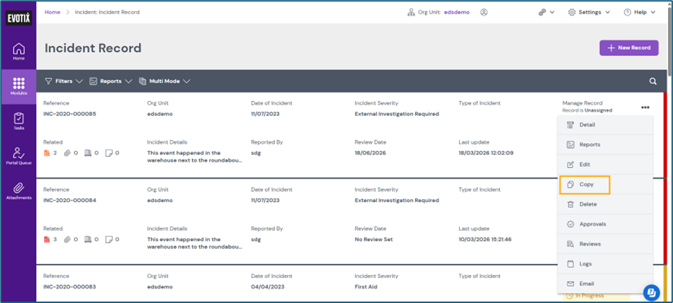- Relevant modules: All modules in Assure that support record copying (Incident Record, Audit, Risk Assessment, Inspection, etc.)