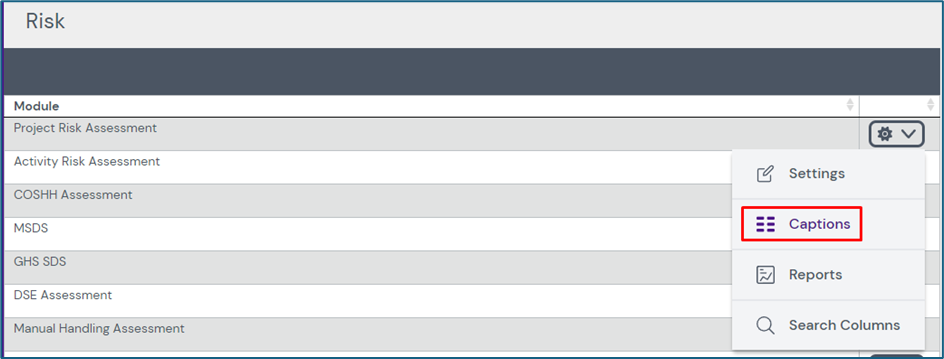 Relevant modules: All Assure modules (Incident Record, Activity Risk Assessment, Job Hazard Analysis, Audit modules, Hazard Spotting, and others). This is a cross-module configuration capability. Changes made in Caption Maintenance for one module do not affect other modules.