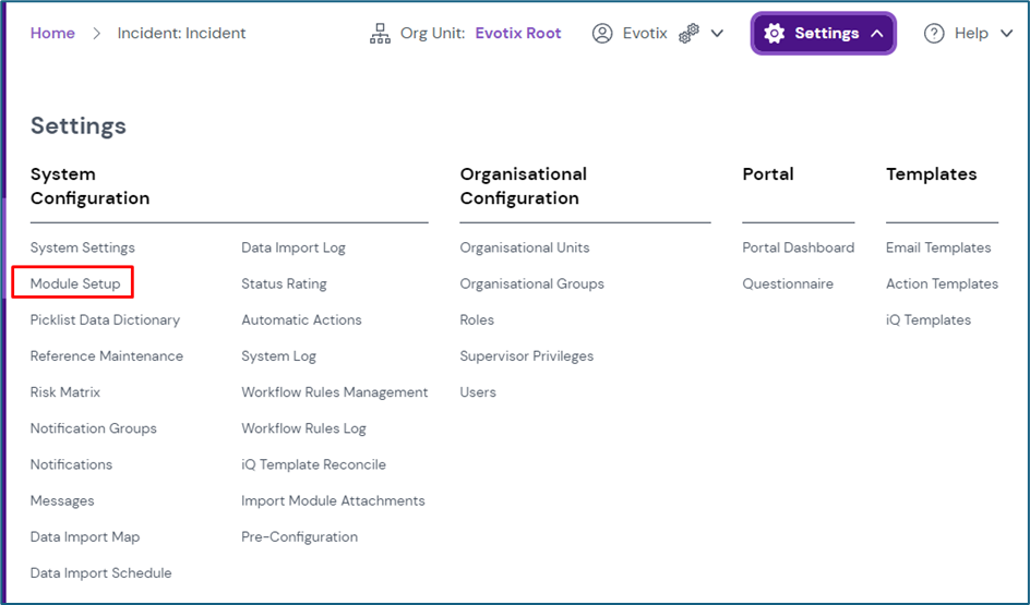 2.1. Locate the module you wish to configure (e.g. Incident Record, Activity Risk Assessment).