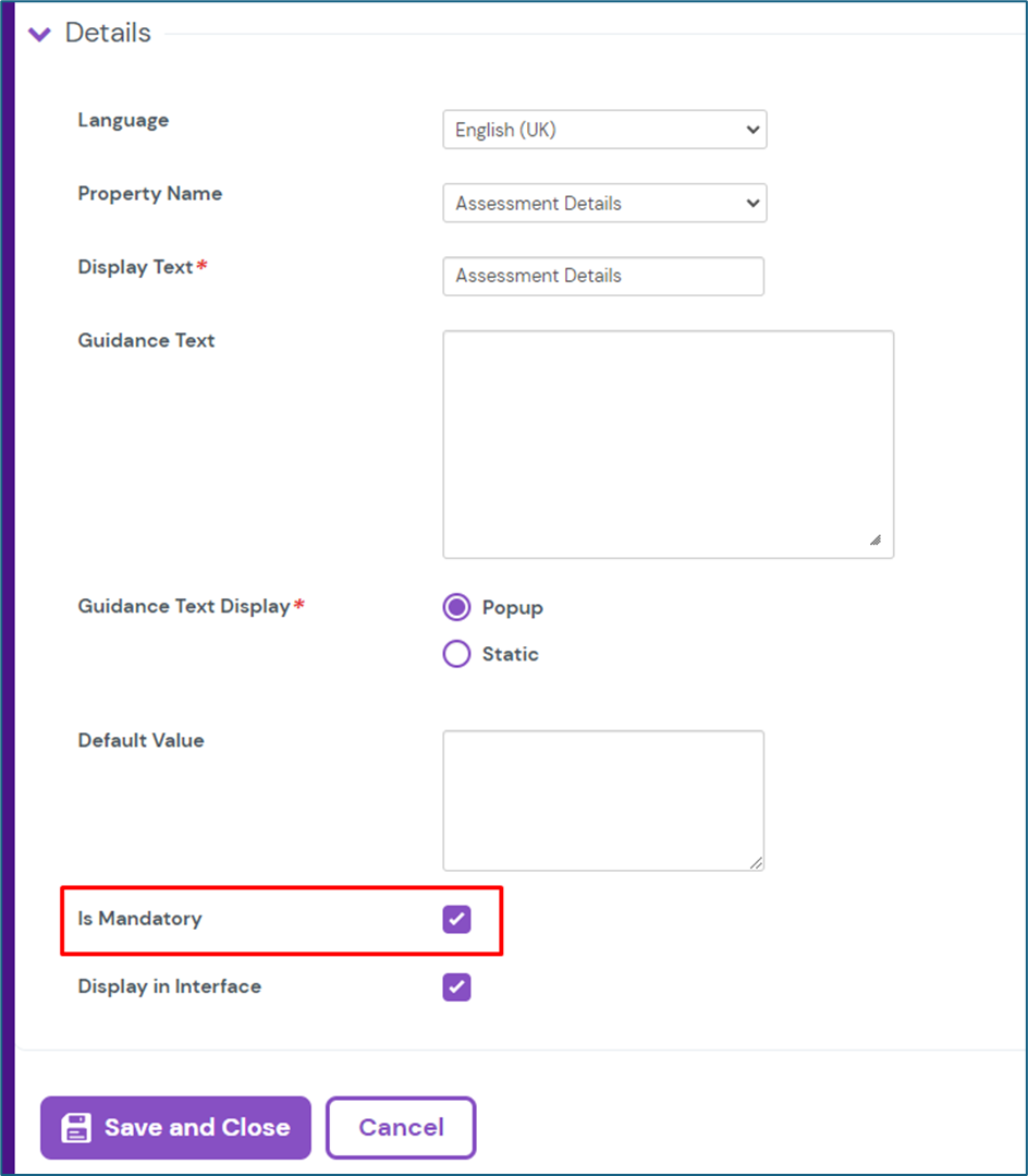 Suggested embedding keywords: make field mandatory assure, caption maintenance assure, required field configuration, mandatory form fields, enforce data entry assure, configure mandatory field assure, module setup captions, is mandatory checkbox assure, property name field assure, incident form required fields, activity risk mandatory fields