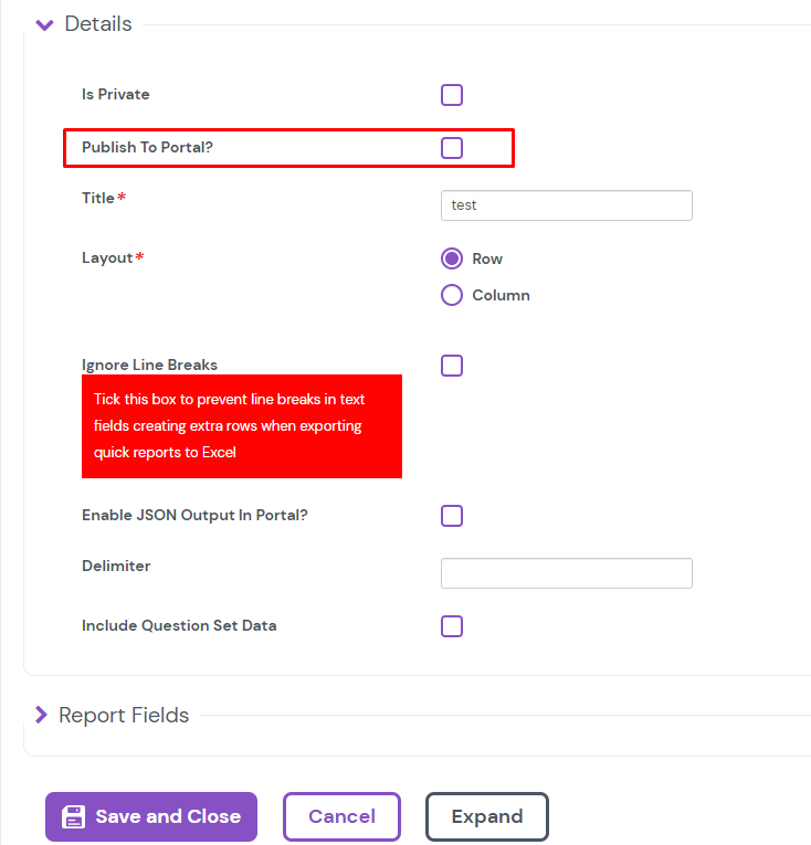Ensure the Publish To Portal? box has been ticked for any reports you wish to be selectable for your Portal.