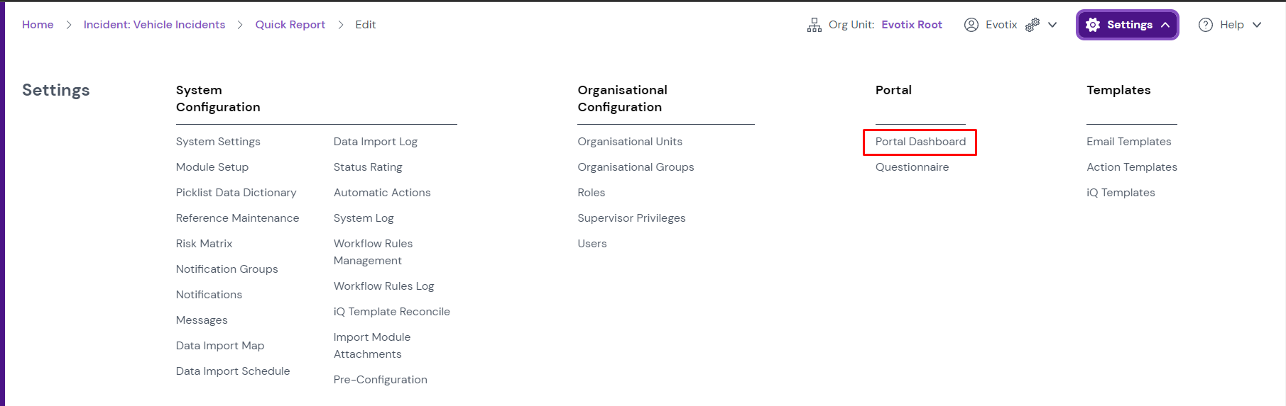 To add your Quick Reports to your Portal, go to Settings > Portal Dashboard