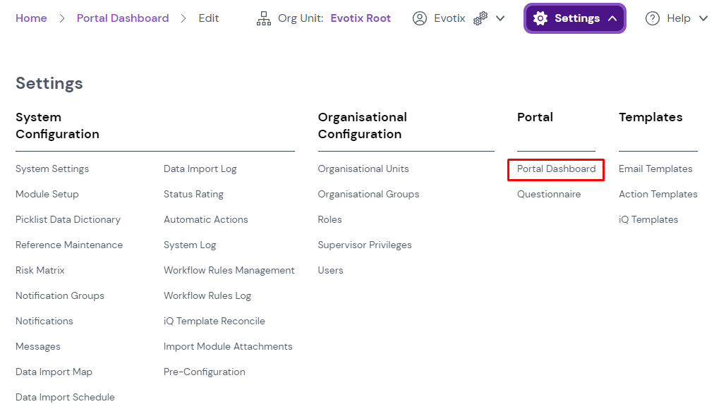 Once the Quick Reports are selectable for the portal go to: Settings > Portal > Portal Dashboard