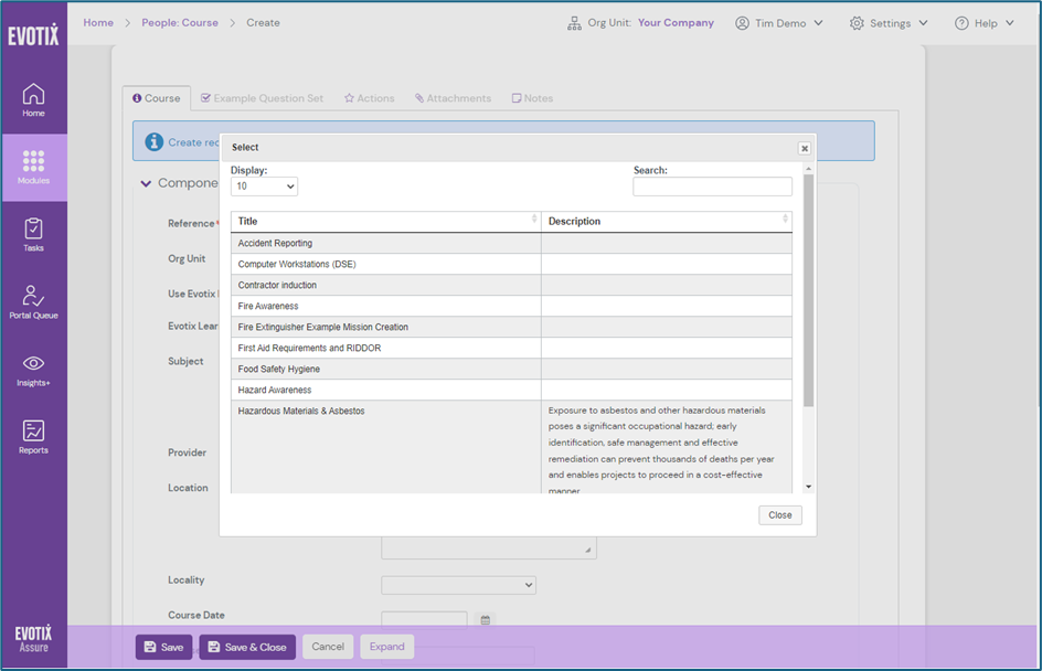 Assigning Evotix Learn training in Assure People & Training module