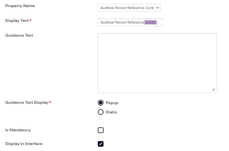 - For reference fields, you must delete the words {Link} and {Free Text} from the display text before you save. In the example below, when you select Auditee Person Reference {Link} in the Property Name field, you need to delete the ‘{Link}’ (highlighted below) from the Display Text field before you save and Close.